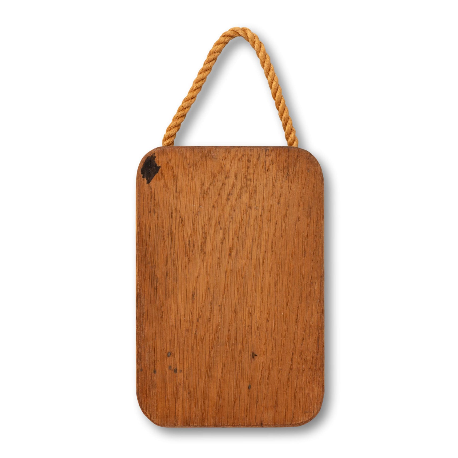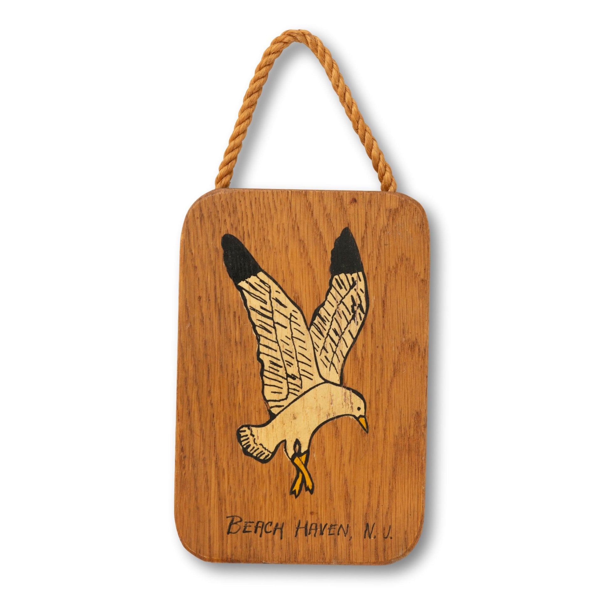 The piece has a very playful seagull painted on an oak block with a rope for hanging.