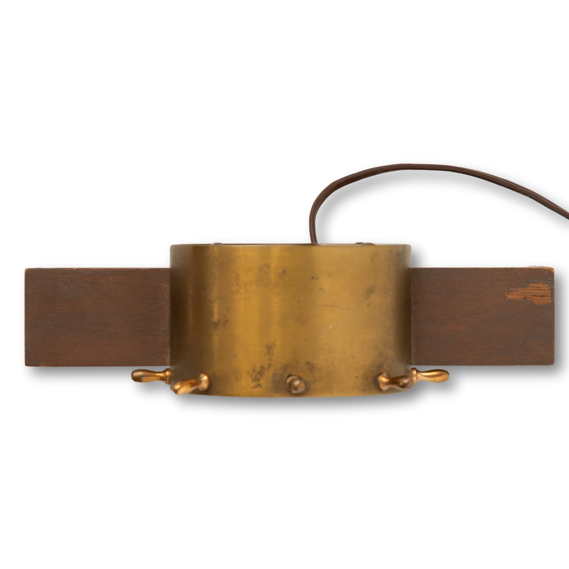 This plug in electric clock is in good working order. A brass clock face with ship wheel handles is set in to wood base with brass feet. Attractive dial face with brushed chrome, brass hands, and a red second hand.