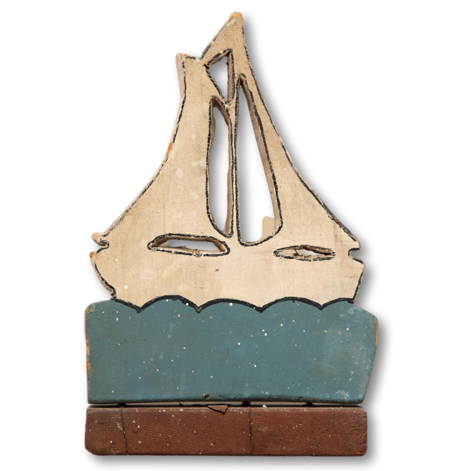 This a a great piece made in an old workshop, with sailboat cutouts, painted and nail to a board.