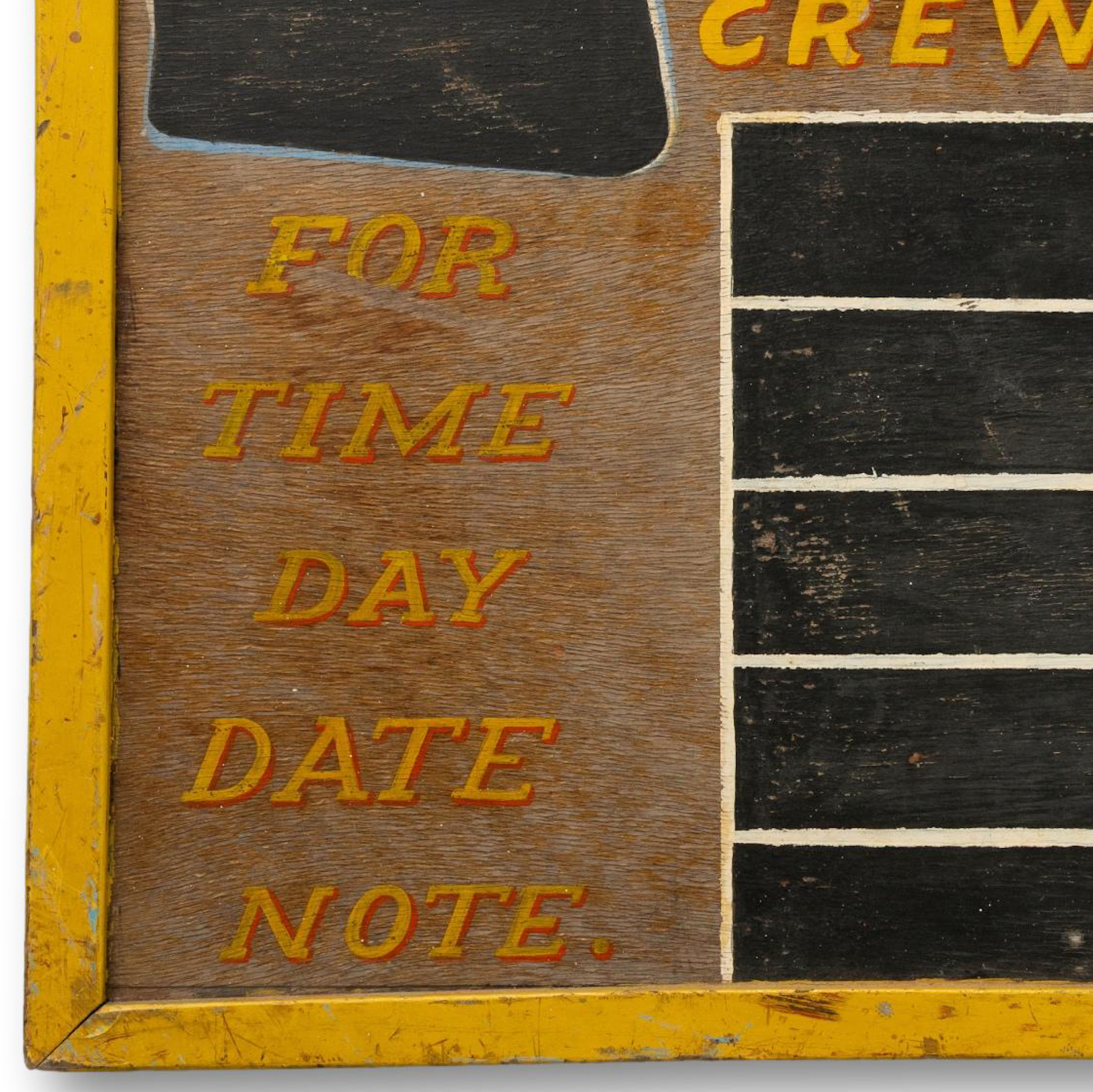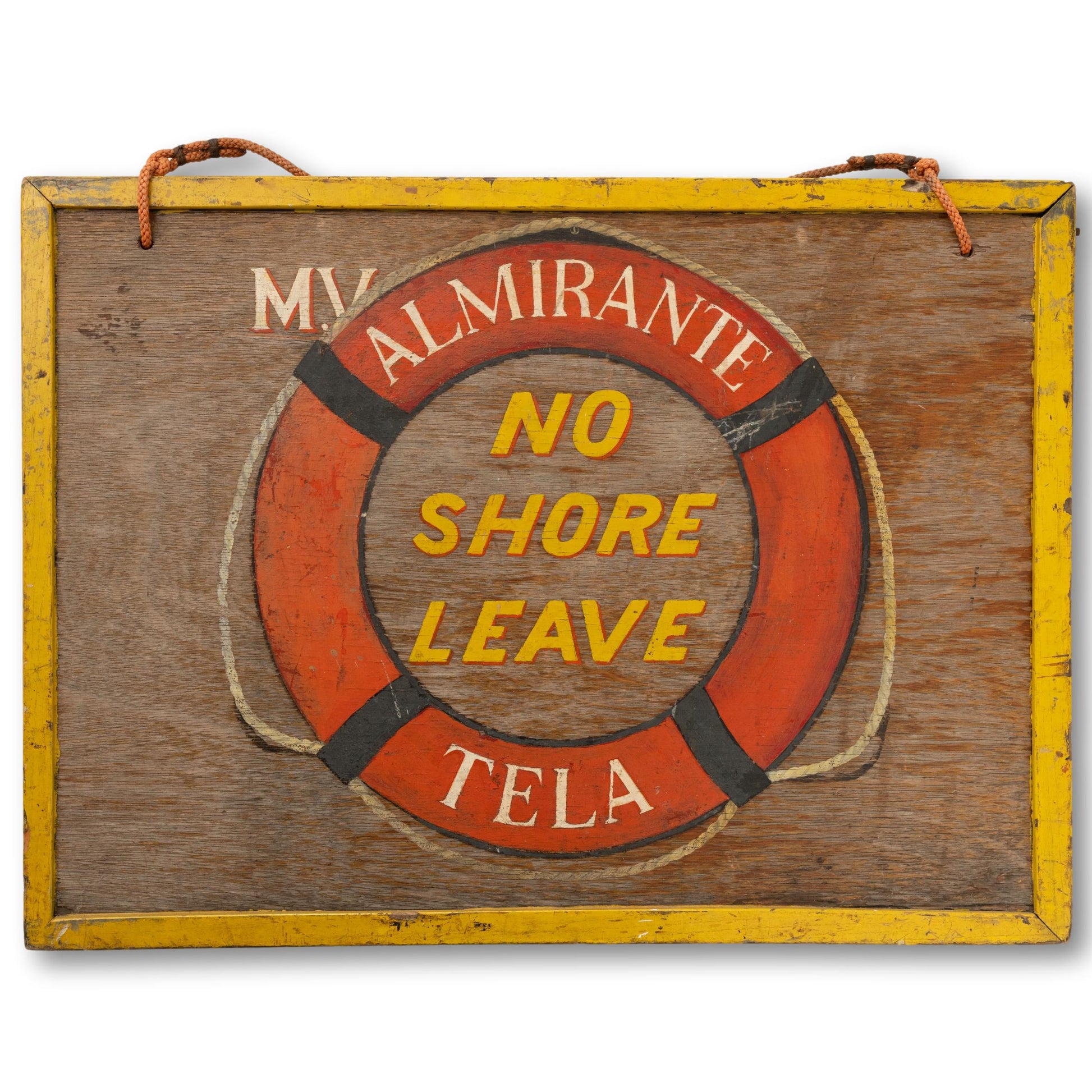 Genuine chalkboard-style operations panel from a 1950s MV (motor vessel) Almirante, indicating when all crew must return to the ship before departure. Reverse "No Shore Leave" side would be flipped or hung once the deadline had passed.