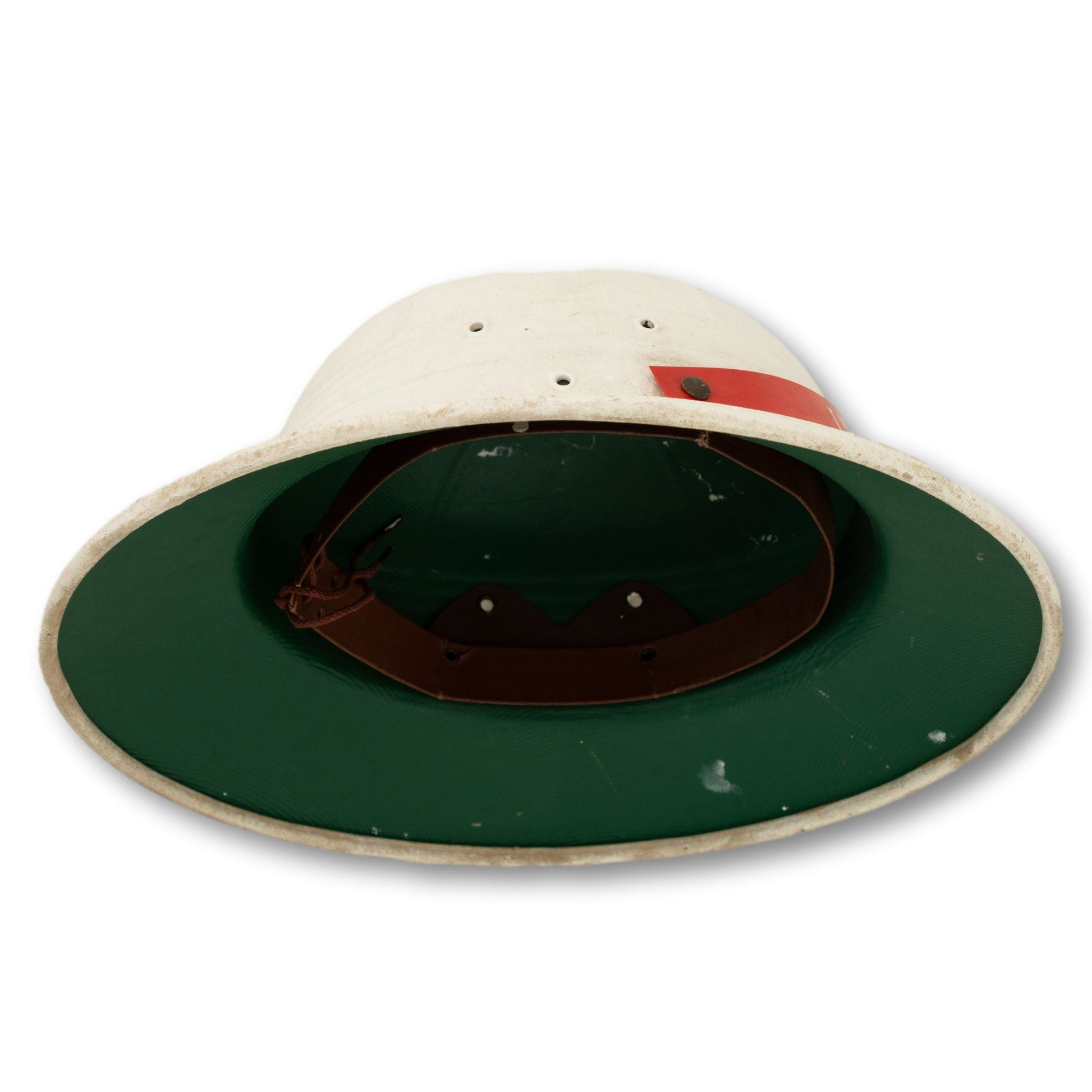 This helmet is made out of a fiberglass composite with white on the outside and green on the inside.
