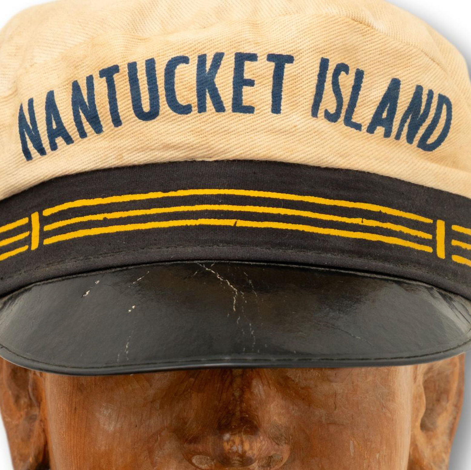 Cotton hat with patent leather brim, printed lettering and yacht motif in gold around the band.