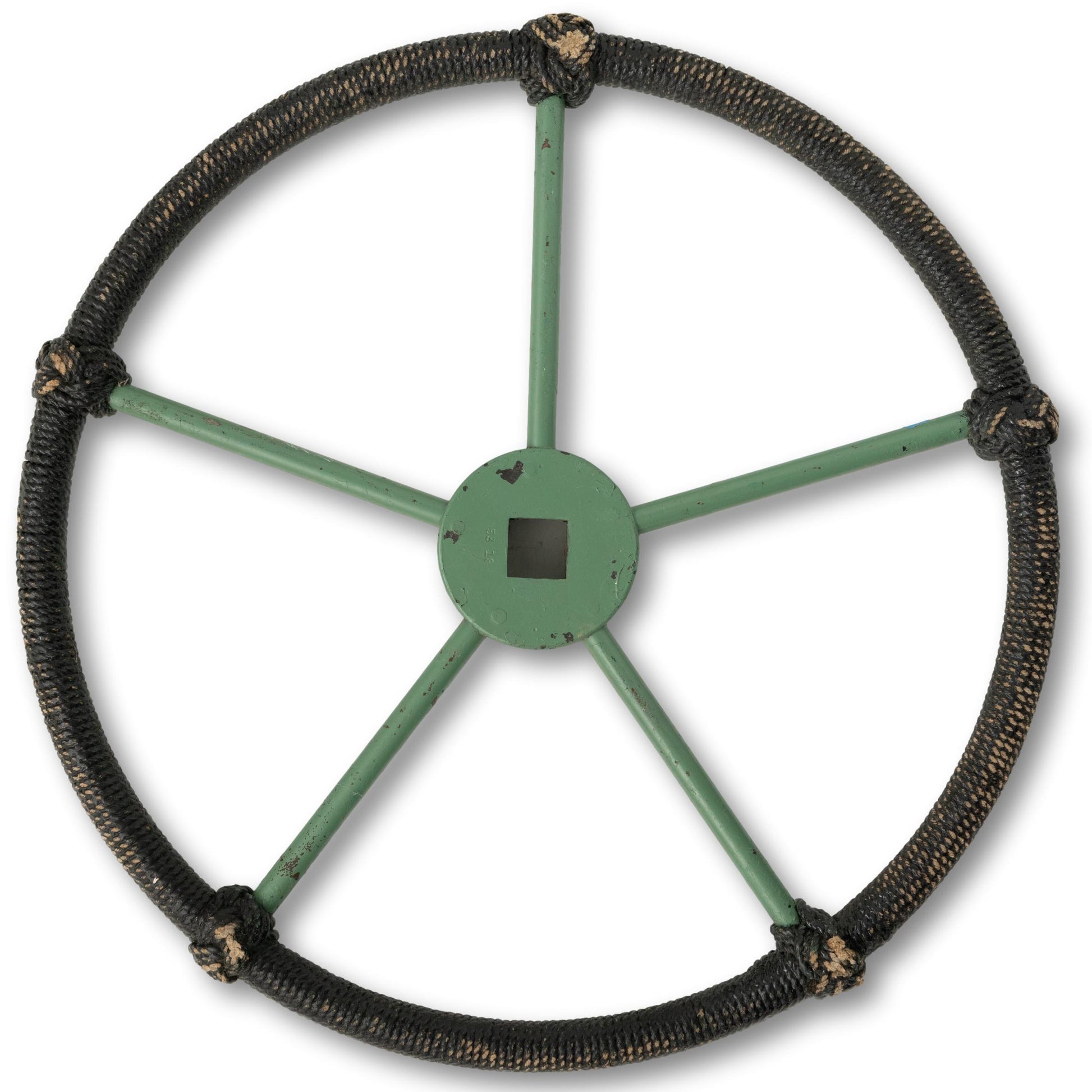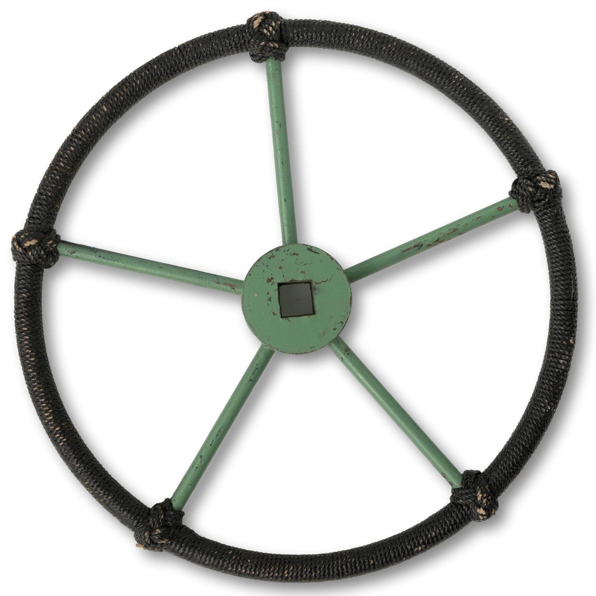 Green painted metal ship’s wheel with unique black rope windings
