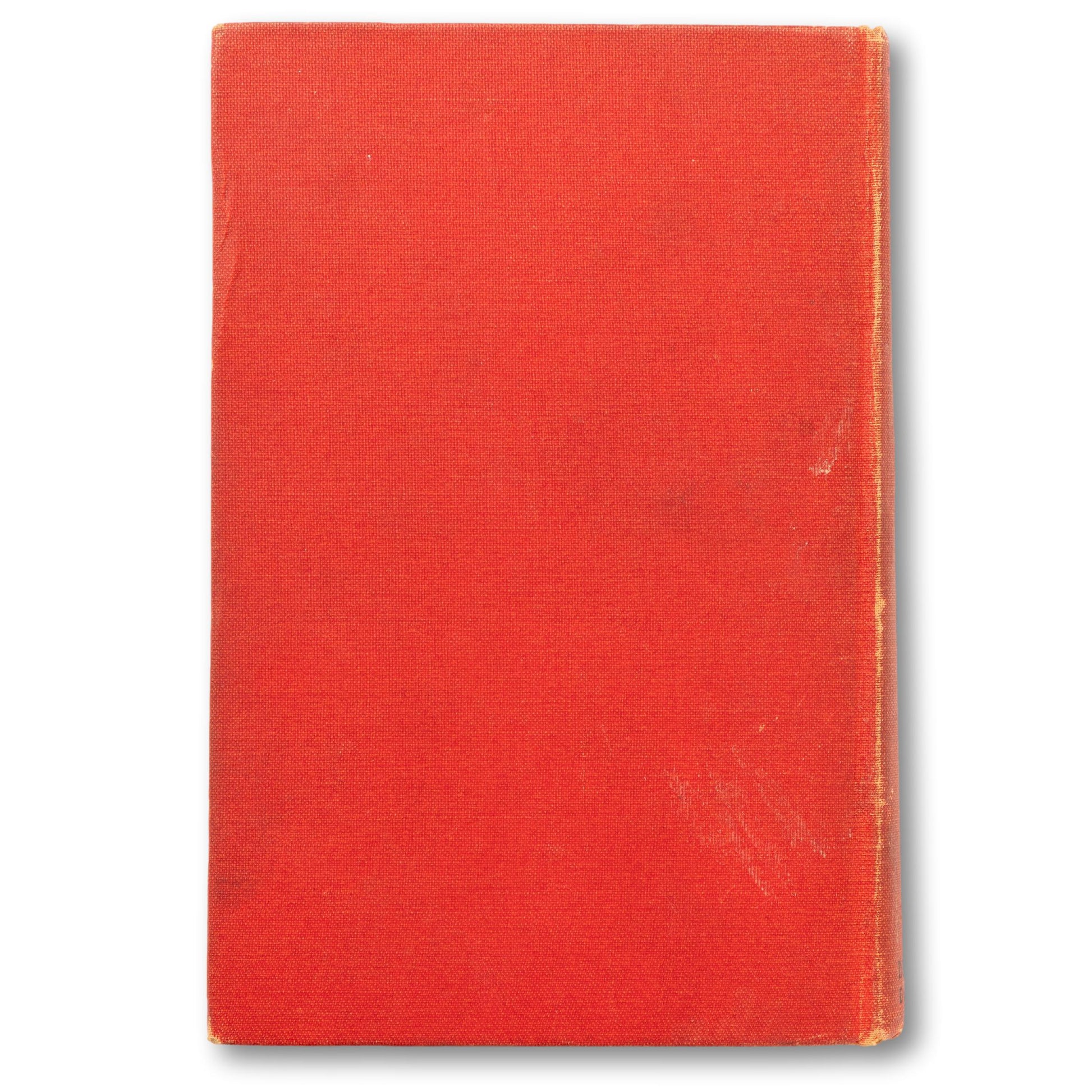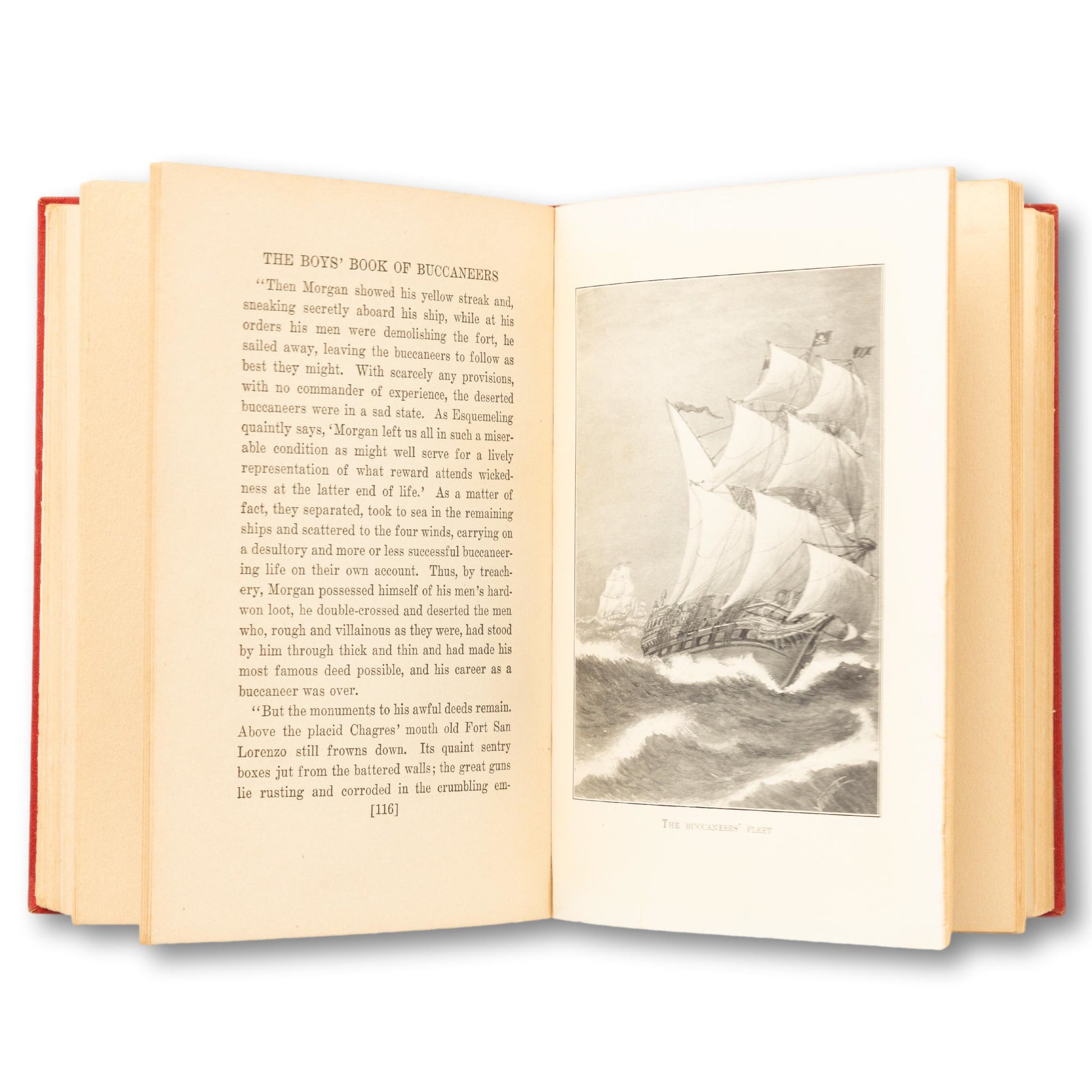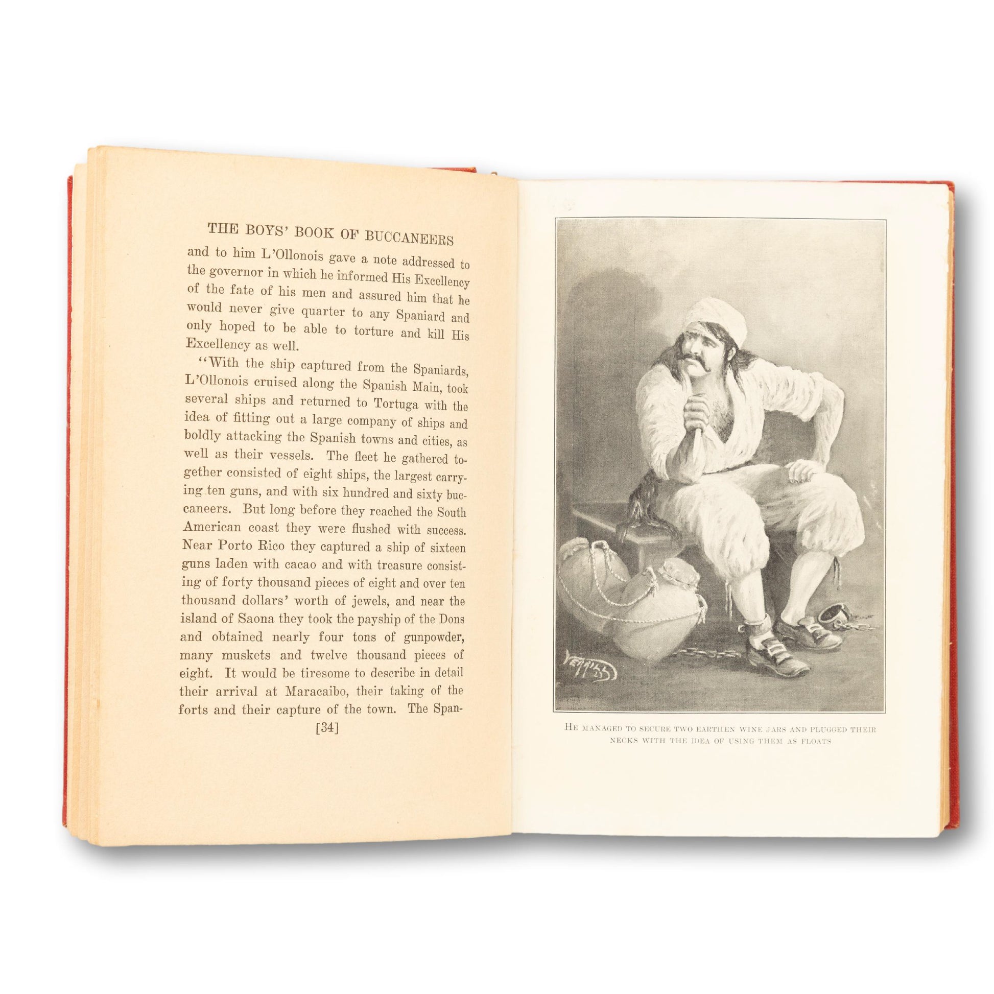 Red cloth cover with skull and crossbones flag makes a great addition to a nautical bookshelf